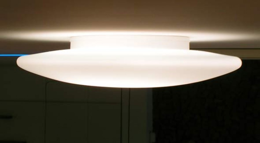Plafon com canopla em alumínio tratado e pintado por processo eletrostático e difusor em vidro.
