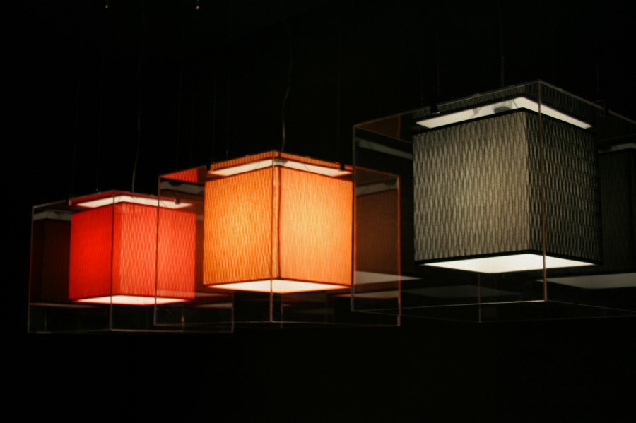 Pendente com duas cúpulas, uma em acrílico transparente e outra em tecido, canopla cromada.